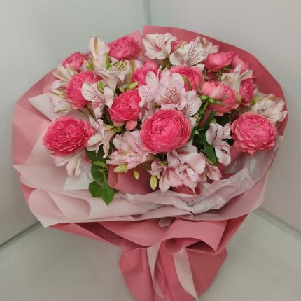 Букет из кустовой пионовидной розы «Ягодный смузи»(Роза кустовая пионовидная Кения , альстромерия )