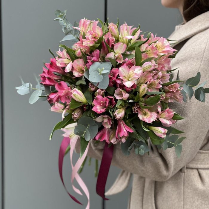 Альстромерия – 15 шт. Эвкалипт – 2 шт. оформление – ленты – 1 шт.