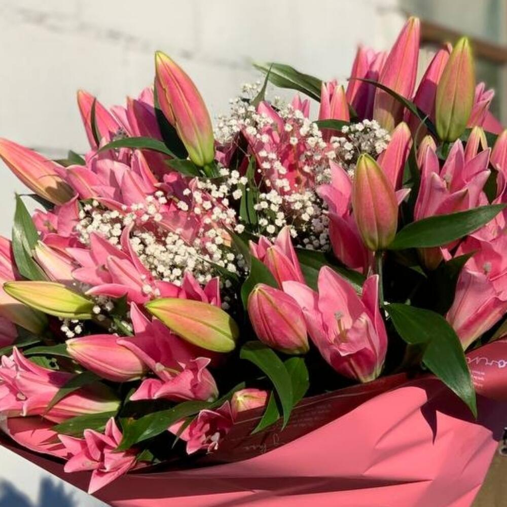Ароматный букет розовых лилий с гипсофилой