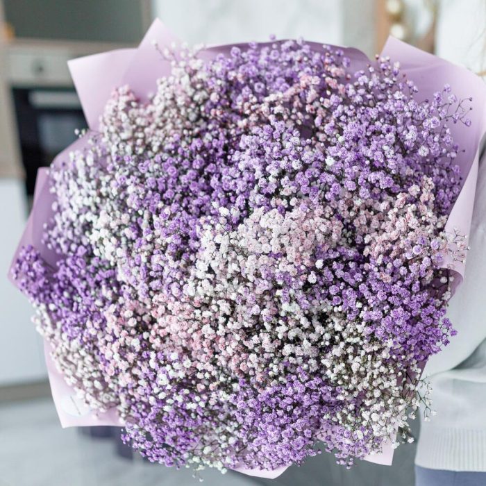 гипсофила цветная – 25 шт.упаковка дизайнерская корейская пленка – 4 шт.Лента атласная – 2 шт.Упаковка транспортировочная пленка – 1 шт.инструкция по уходу за цветами – 1 шт.