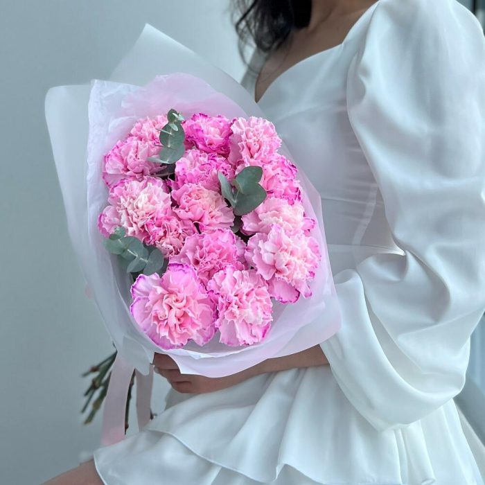 15 ярко-розовых гвоздик с эвкалиптом (букет N 45)