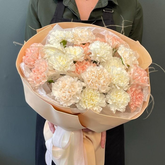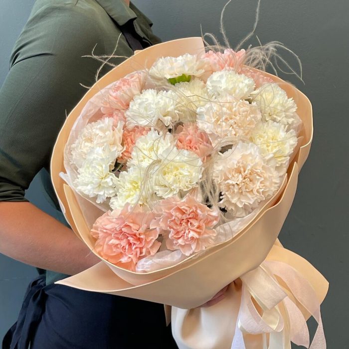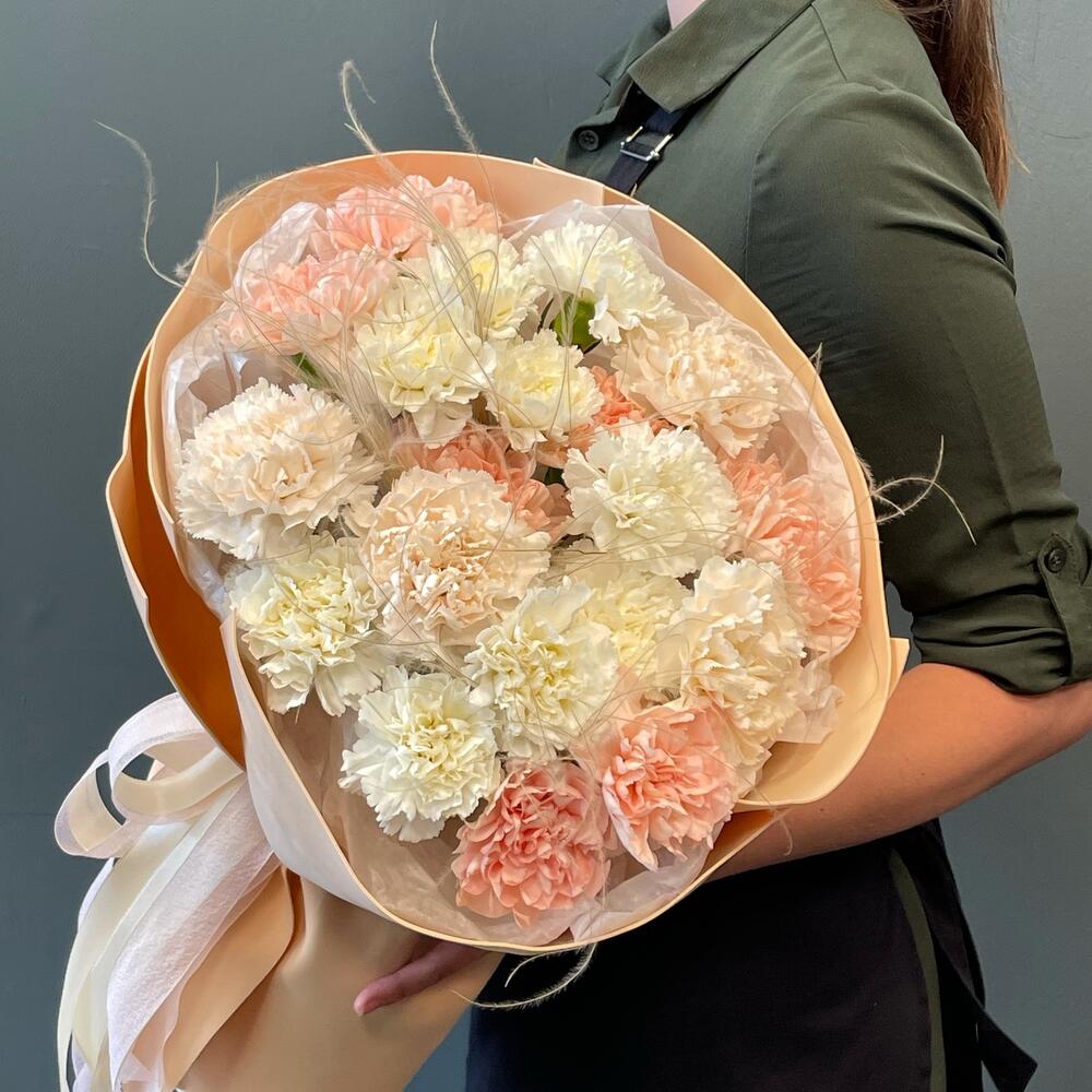 Лента – 2 шт.Тишью – 2 шт.Упаковка дизайнерская – 2 шт.Ковыль – 2 шт.Гвоздика одноголовая – 21 шт.