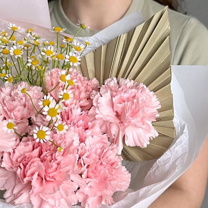 Розовая гвоздика – 7 шт.пальма сухоцвет – 1 шт.голландская ромашка – 3 шт.