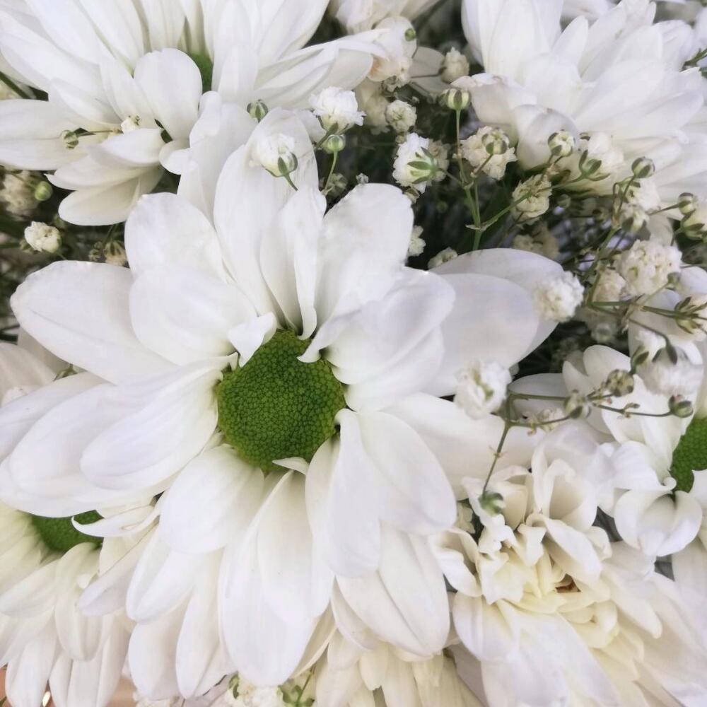 Хризантема и гипсофила в шляпной коробке, цвет белый