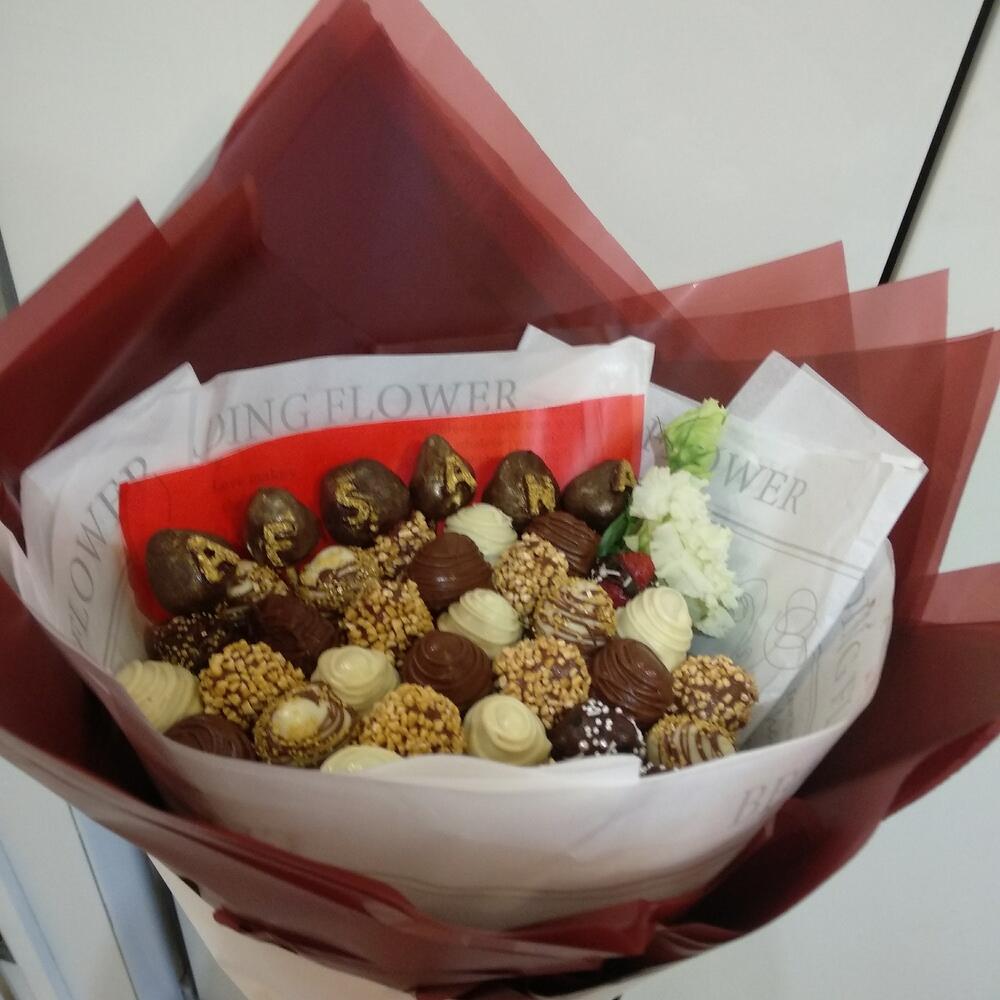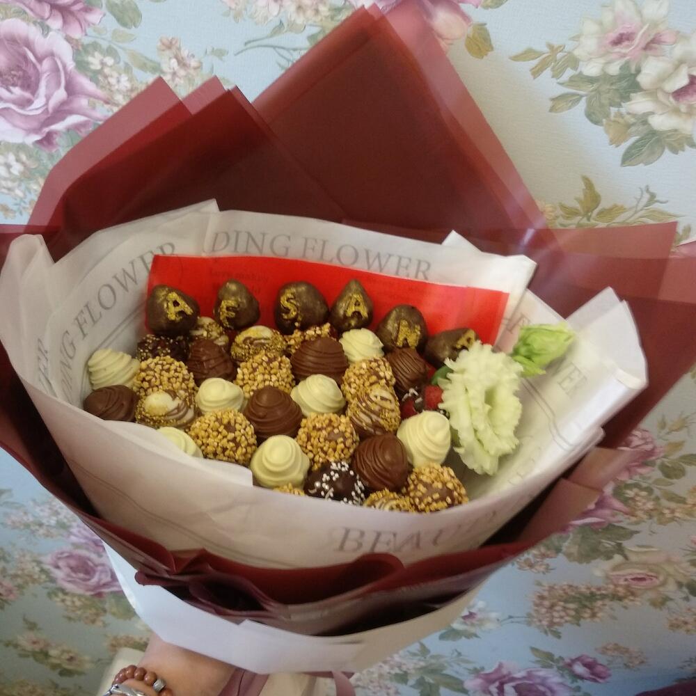 Клубника в шоколаде callebaut (бельгия) – 46 шт.Дизайнерская упаковка – 1 шт.Лизиантус – 1 шт.транспортировочная пленка – 1 шт.