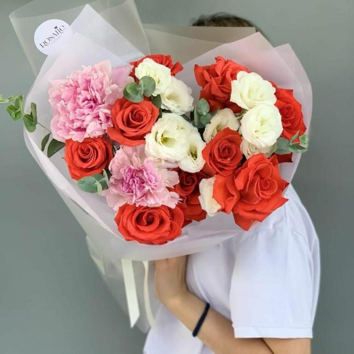 Альстромерии, Гвоздики, Кустовые розы, Лизиантусы, Розы, Хризантемы