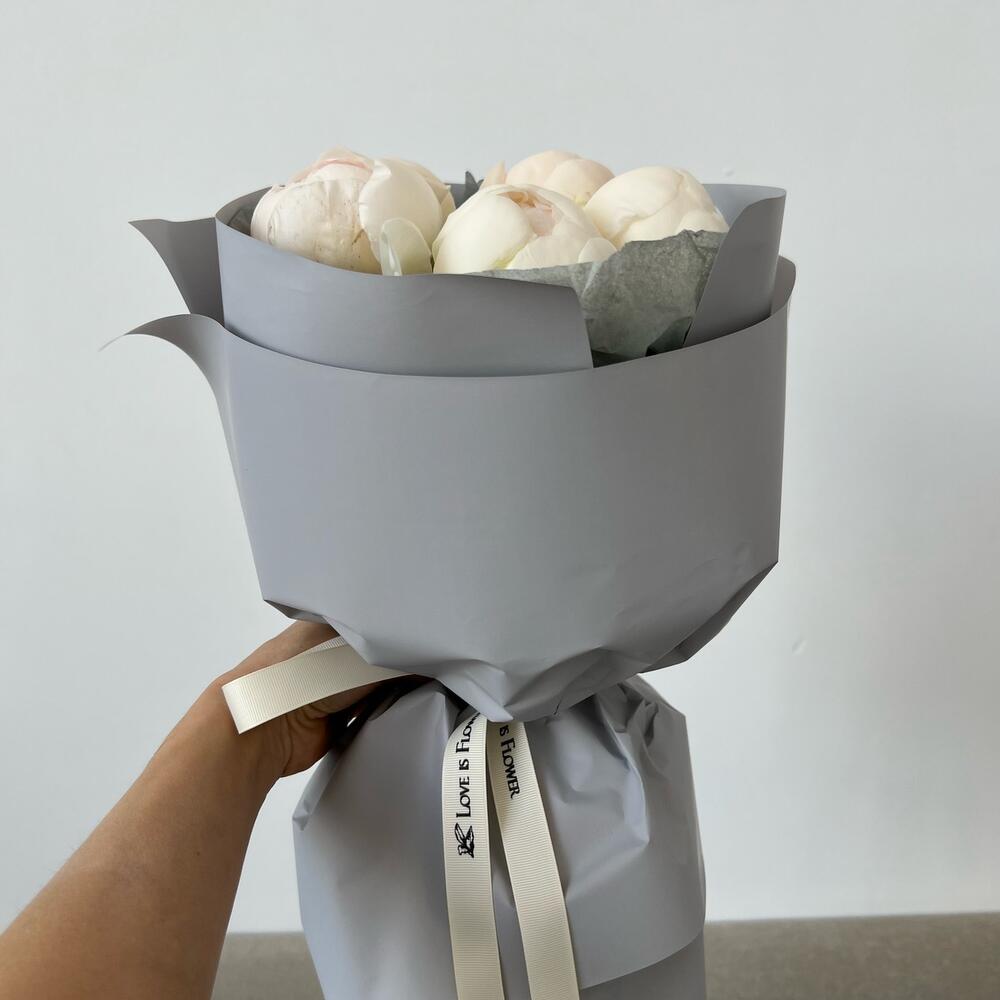 Упаковка дизайнерская – 1 шт.Лента репсовая – 1 шт.наклейка фирменная – 1 шт.пион клод тейн – 5 шт.любовь флориста (бесплатно) – 1 шт.