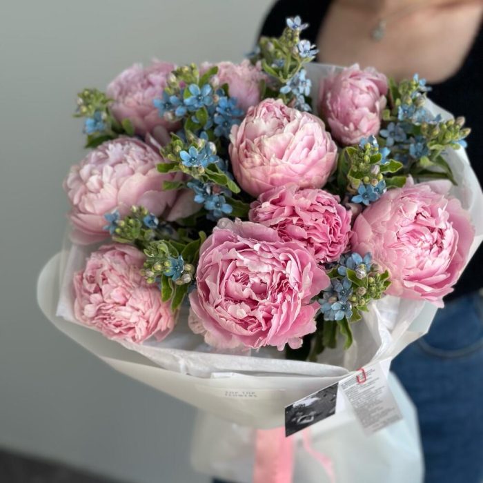 Пион – 9 шт.Оксипеталум – 10 шт.Упаковка дизайнерская – 1 шт.Средство для продления жизни цветов – 1 шт.
