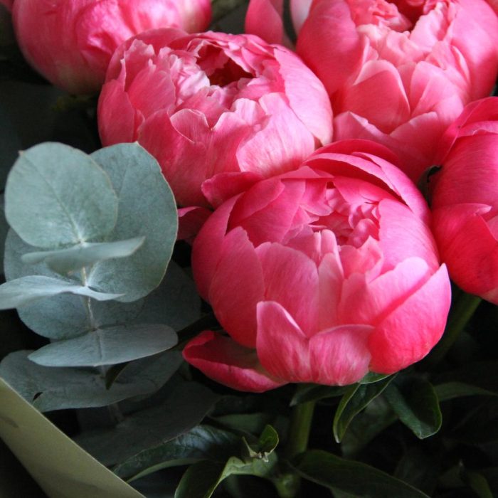 Пион – 7 шт.Эвкалипт – 5 шт.Упаковка – 2 шт.Лента атласная – 2 шт.
