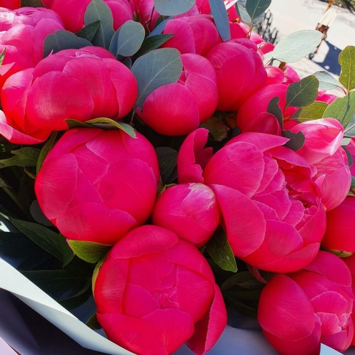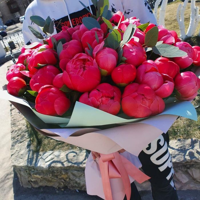 Букет из 101 розового пиона в дизайнерской коробке "Мадам Баттерфляй"