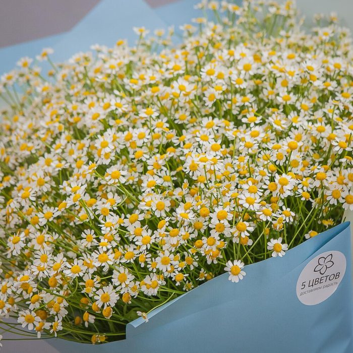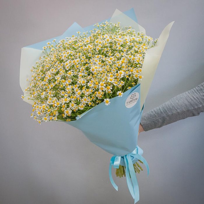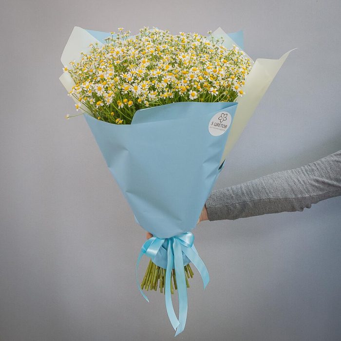 ромашки – 101 шт.дизайнерская упаковка и атласная лента – 1 шт.