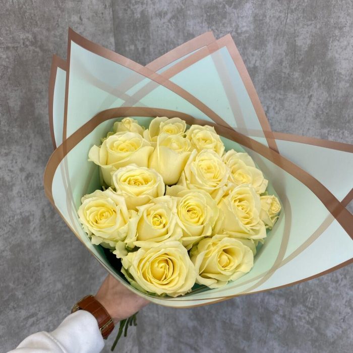 Роза – 15 шт.Корейская упаковка – 3 шт.Атласная лента – 1 шт.