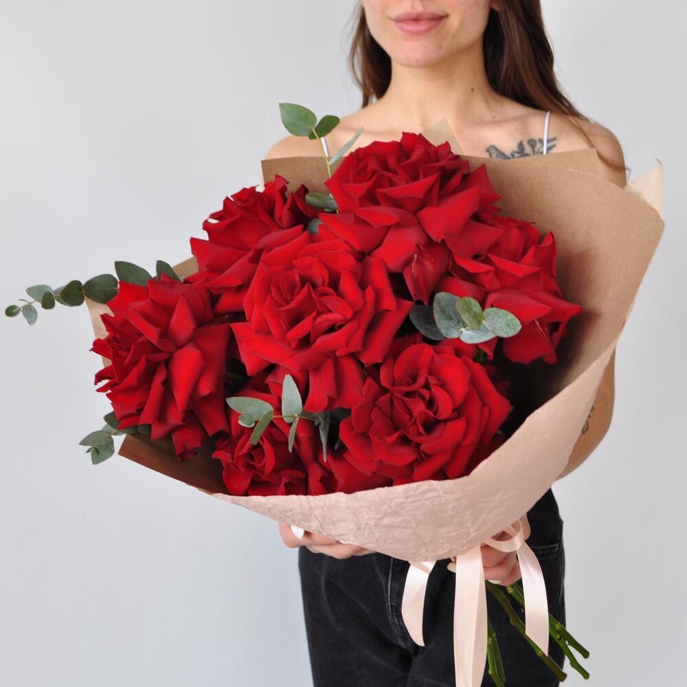 Эвкалипт – 1 шт.Лента атласная – 1 шт.Крафт – 1 шт.Роза французская – 7 шт.Крафт жатый – 1 шт.