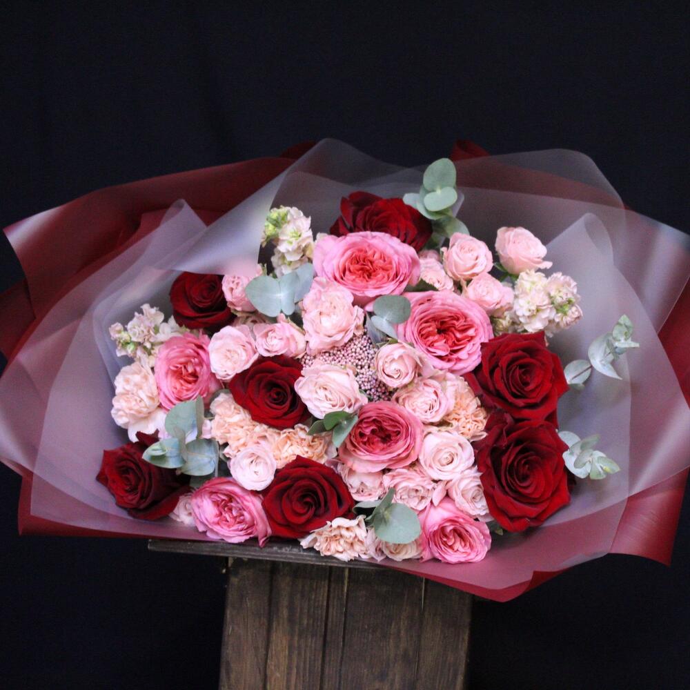 Роза Эксплорер – 7 шт.роза пионовидная пинк экспрешн – 6 шт.Озотамнус – 1 шт.Диантус – 5 шт.Роза кустовая пионовидная мадам бомбастик – 5 шт.Маттиола – 3 шт.Эвкалипт – 2 шт.Пленка дизайнерская – 3 шт.Лента атласная – 1 шт.
