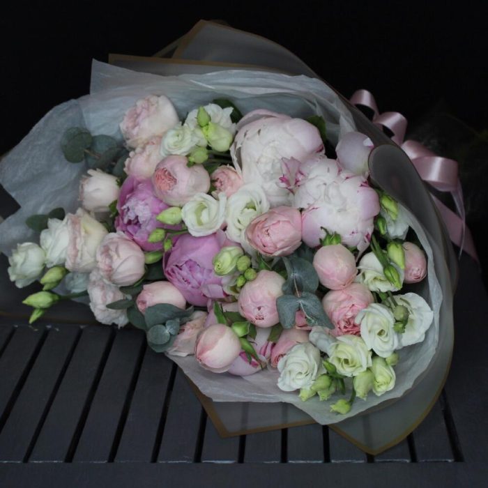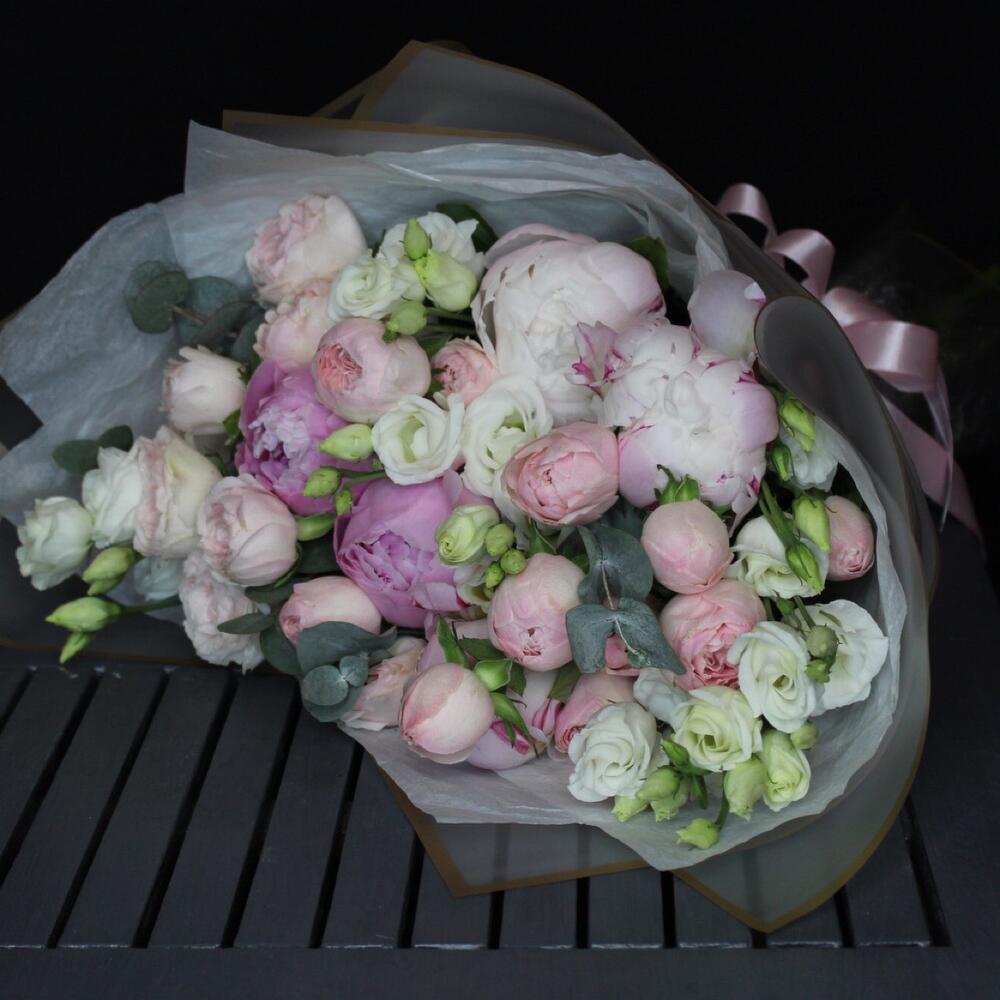 Пион Сара Бернар – 5 шт.роза кустовая пионовидная мэнсфилд парк – 4 шт.эустома розита вайт – 4 шт.Эвкалипт – 2 шт.Тишью белое – 2 шт.Пленка матовая – 2 шт.Лента атласная – 1 шт.