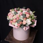 Эвкалипт – 2 шт.Шляпная коробка – 1 шт.Оазис флористический – 1 шт.эустома белая – 3 шт.Роза кустовая пионовидная мадам бомбастик – 6 шт.Пленка дизайнерская – 1 шт.
