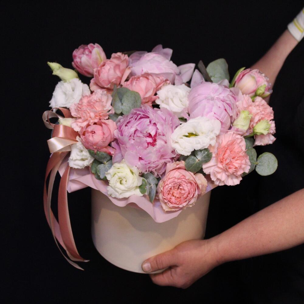 Эвкалипт – 1 шт.Эустома – 2 шт.Лента атласная – 1 шт.Диантус – 3 шт.Шляпная коробка – 1 шт.Пион Сара Бернар – 3 шт.Оазис флористический – 1 шт.Пленка дизайнерская – 1 шт.Роза кустовая пионовидная джульетта – 1 шт.тюльпан пионовидный фокстрот – 2 шт.