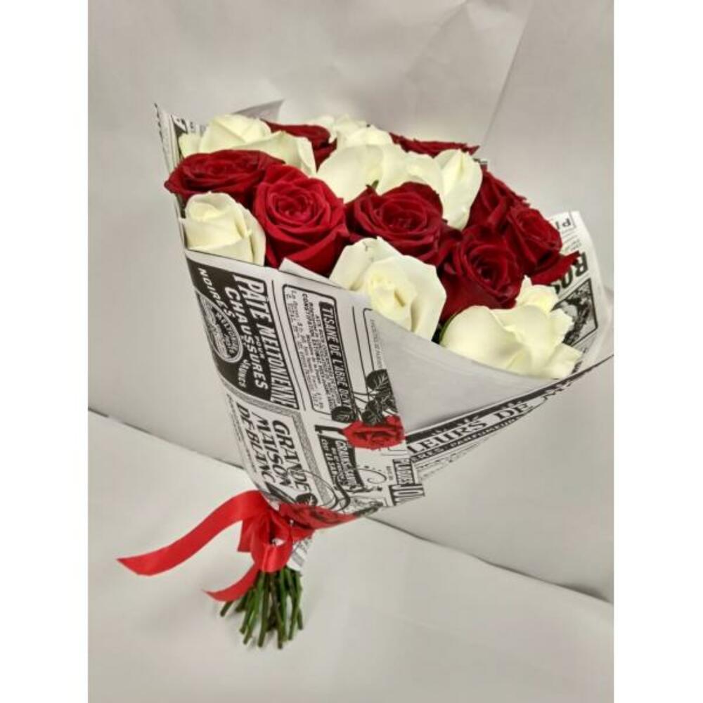 роза красного цвета 60 см – 15 шт.роза белая аваланш 60 см – 10 шт.Упаковка – 1 шт.