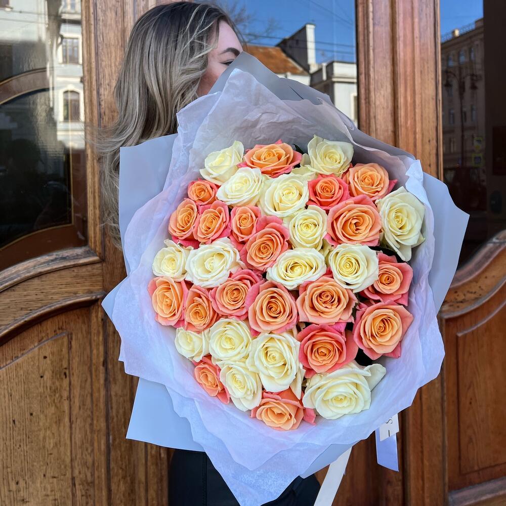 Роза белая 60 см – 16 шт.Роза коралловая 60 см – 19 шт.Дизайнерская упаковка – 3 шт.Тишью – 5 шт.Лента атласная – 2 шт.
