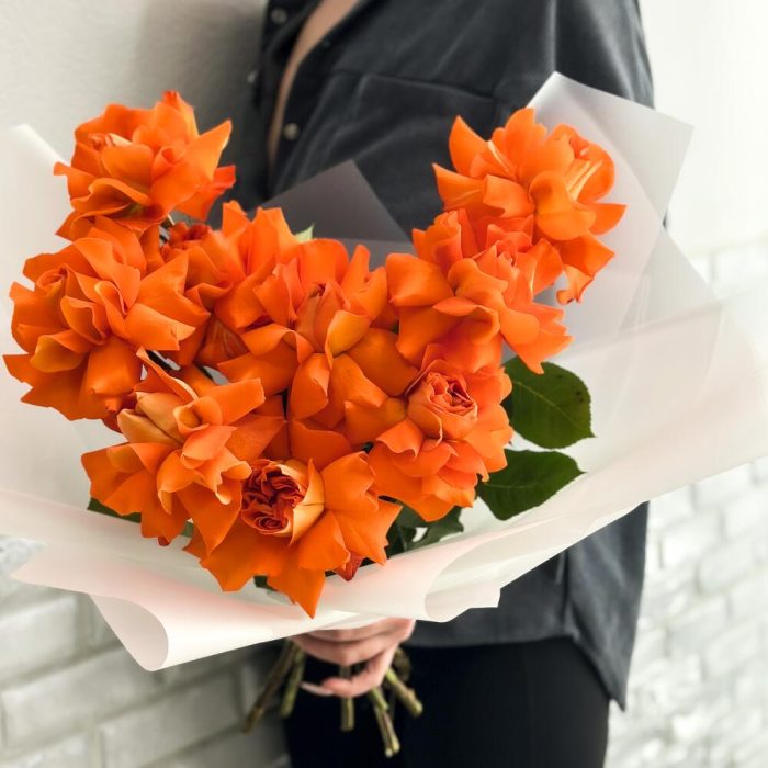 Пленка матовая – 3 шт.Открыточка с вашими пожеланиями – 1 шт.Лента брендированная – 1 шт.подкормка для срезанных цветов – 1 шт.инструкция по уходу за цветами – 1 шт.роза мандарин экспрешен – 9 шт.