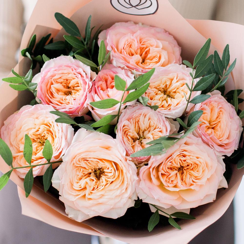 Букет из 9 персиковых пионовидных роз Flash Back 40 см c фисташкой в кремовой пленке