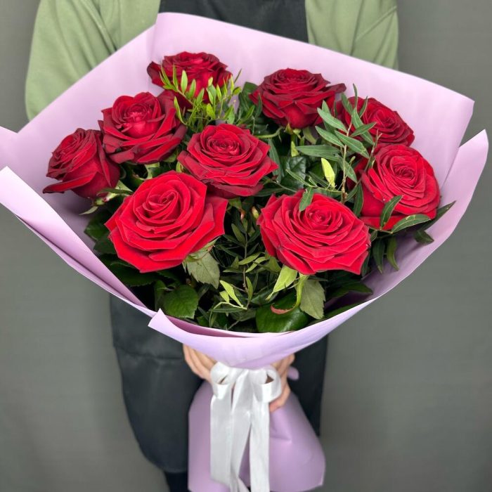 Лента атласная – 1 шт.Фисташка – 2 шт.Упаковка дизайнерская – 1 шт.Роза одноголовая россия – 9 шт.