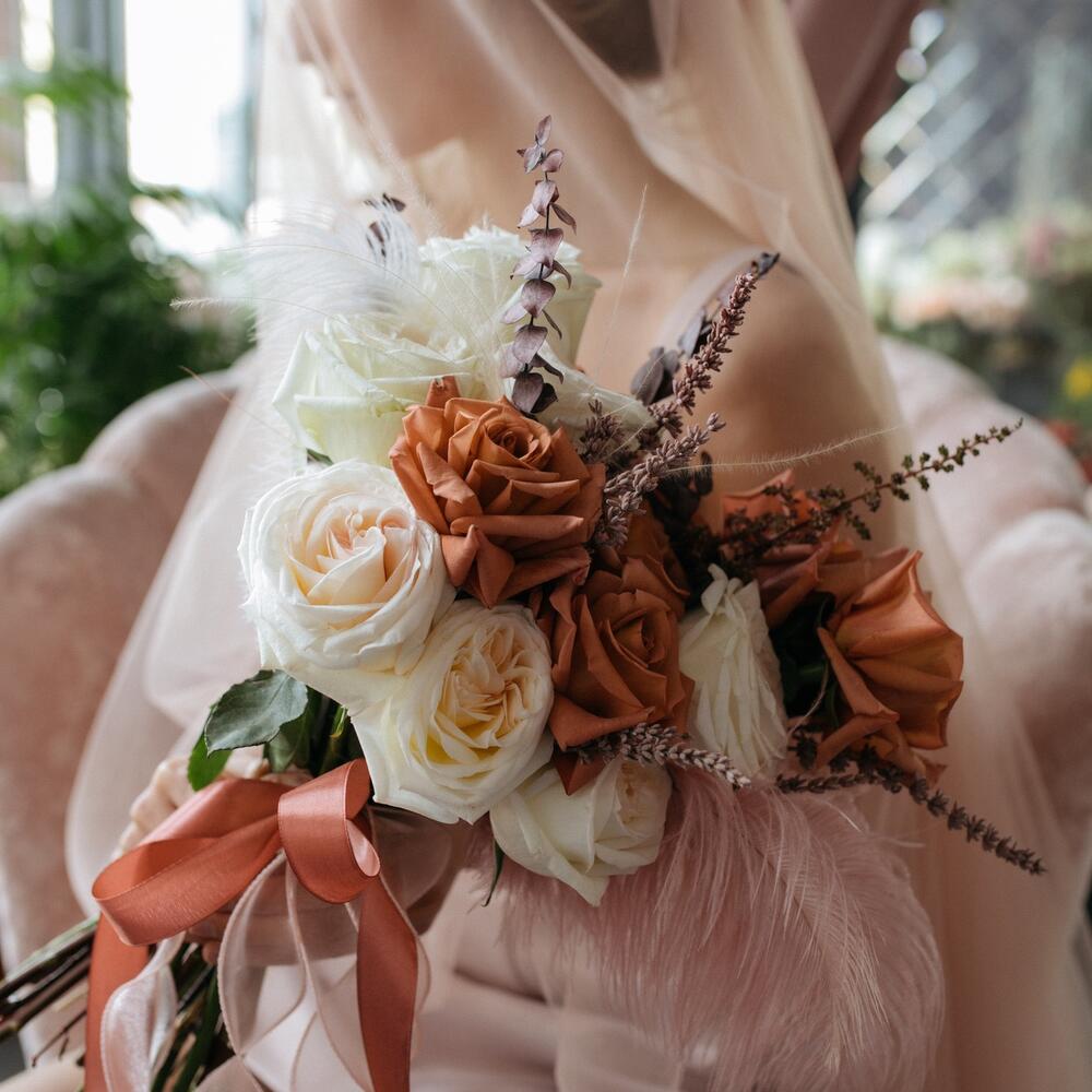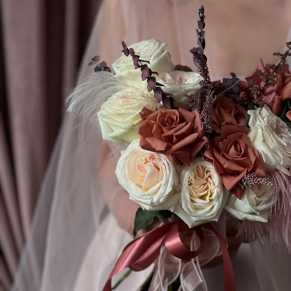 Эвкалипт – 3 шт.Органза – 1 шт.Пионовидная роза – 8 шт.Атласная лента – 2 шт.Одноголовая роза – 7 шт.перо декоративное – 3 шт.сухоцветы пучок – 3 шт.розовая лаванда – 7 шт.