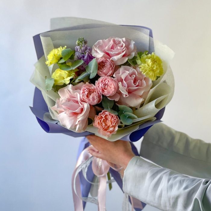 Лента – 1 шт.Маттиола – 1 шт.Роза кустовая – 1 шт.Эвкалипт – 1 шт.Роза одноголовая – 3 шт.Гвоздика – 3 шт.Упаковка дизайнерская – 1 шт.
