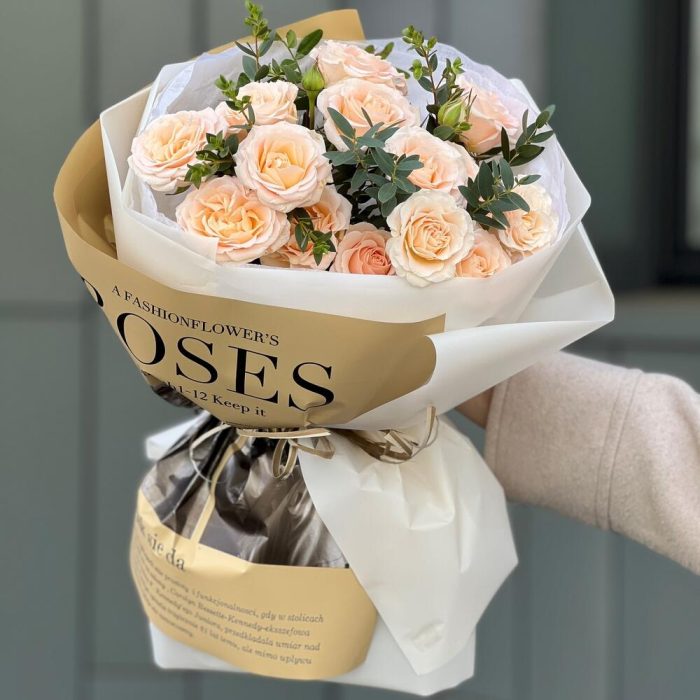 Нежный букет в стильном оформлении из кустовых роз и эвкалипта!