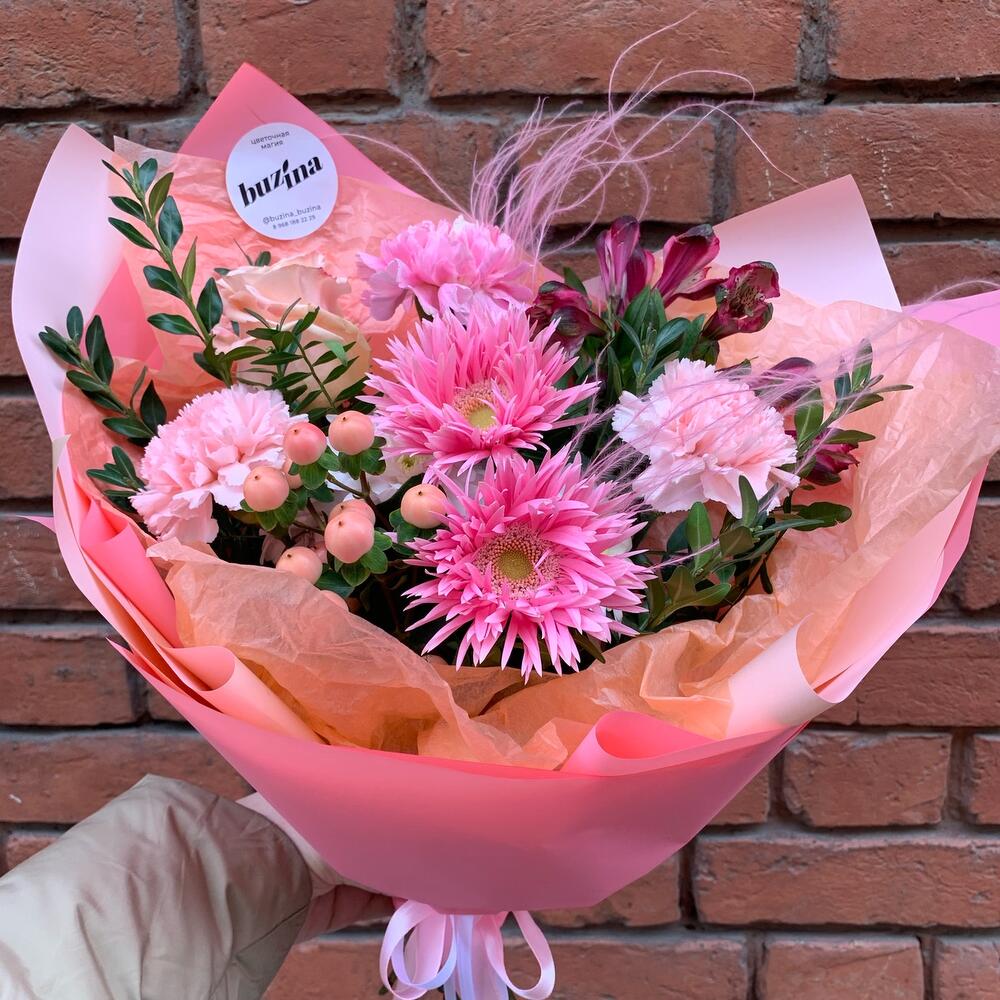 Гербера – 2 шт.Роза пионовидная – 1 шт.Гвоздика – 3 шт.Гиперикум – 1 шт.Альстромерия – 1 шт.Пистация – 2 шт.Упаковка дизайнерская – 1 шт.