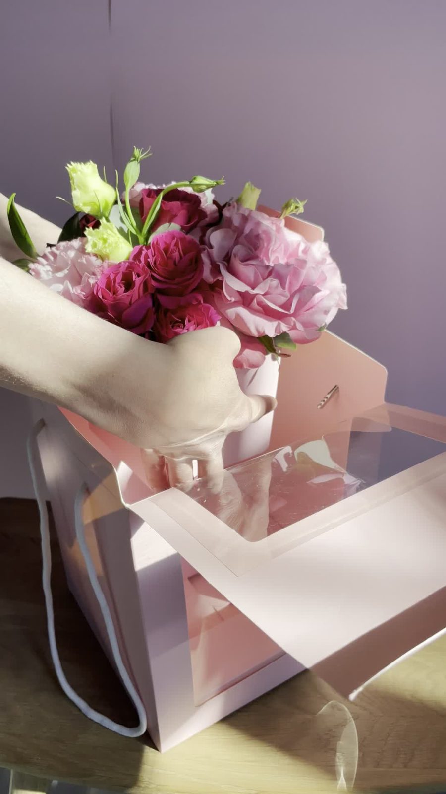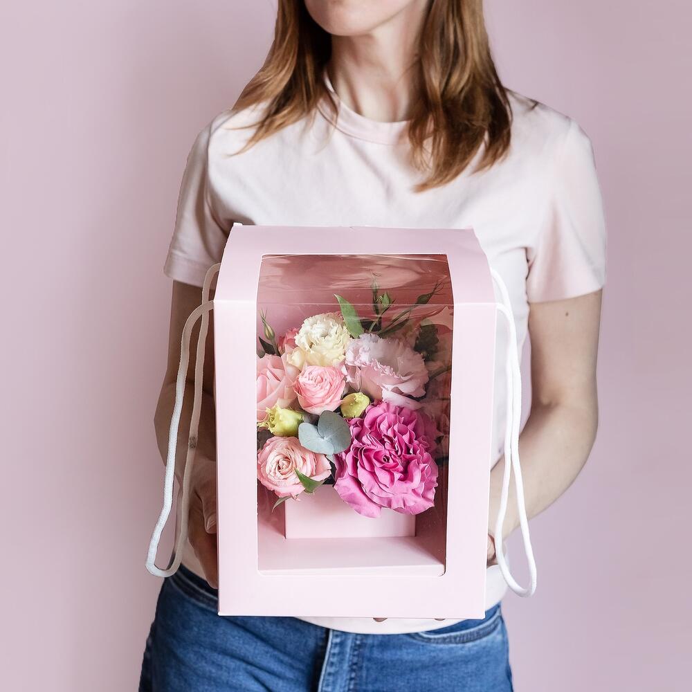 Композиция из свежих цветов в коробке с прозрачным окном.