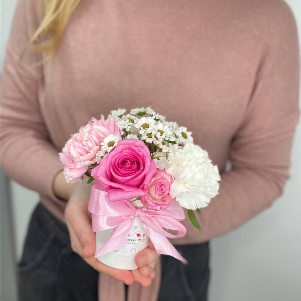 “Атлас☁️” – цветочная композиция с зефиром в деревянном ящике