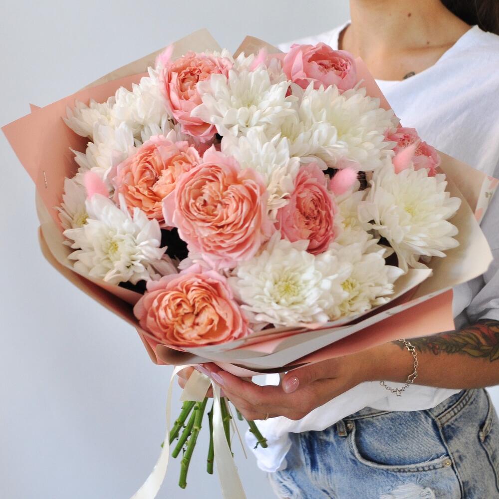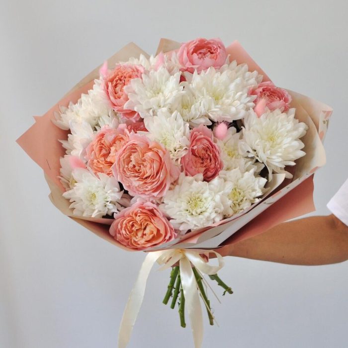Словно нежные крылья ангела – невероятное сочетание красивых пионовидных роз и белоснежной хризантемы.Такой букет станет отличным поводом сказать девушке, маме или бабушке, как вы дорожите ей и цените её