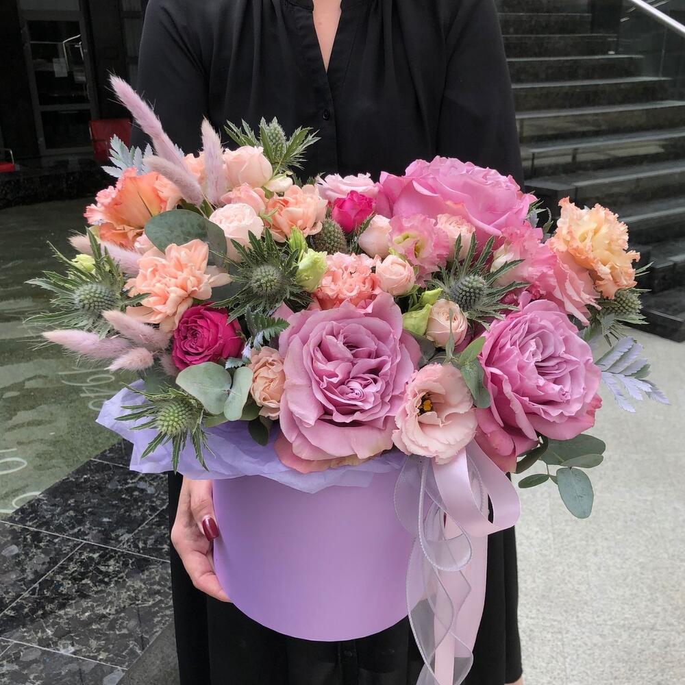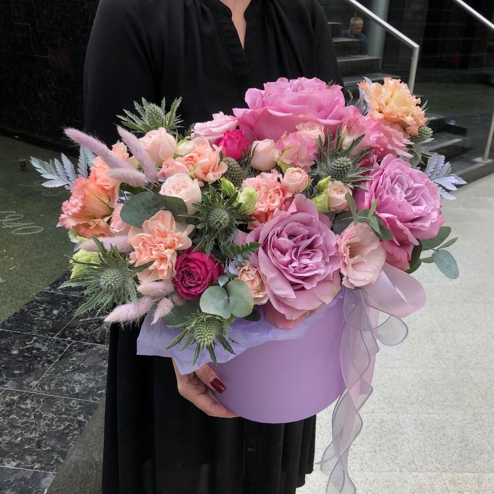 Роза пионовидная – 3 шт.Лизиантус – 3 шт.Роза бомбастик кустовая премиум – 3 шт.Гвоздика – 3 шт.роза мисти бабл пионовидная – 1 шт.Эрингиум – 1 шт.папопотник – 4 шт.Коробка – 1 шт.Оазис флористический – 2 шт.