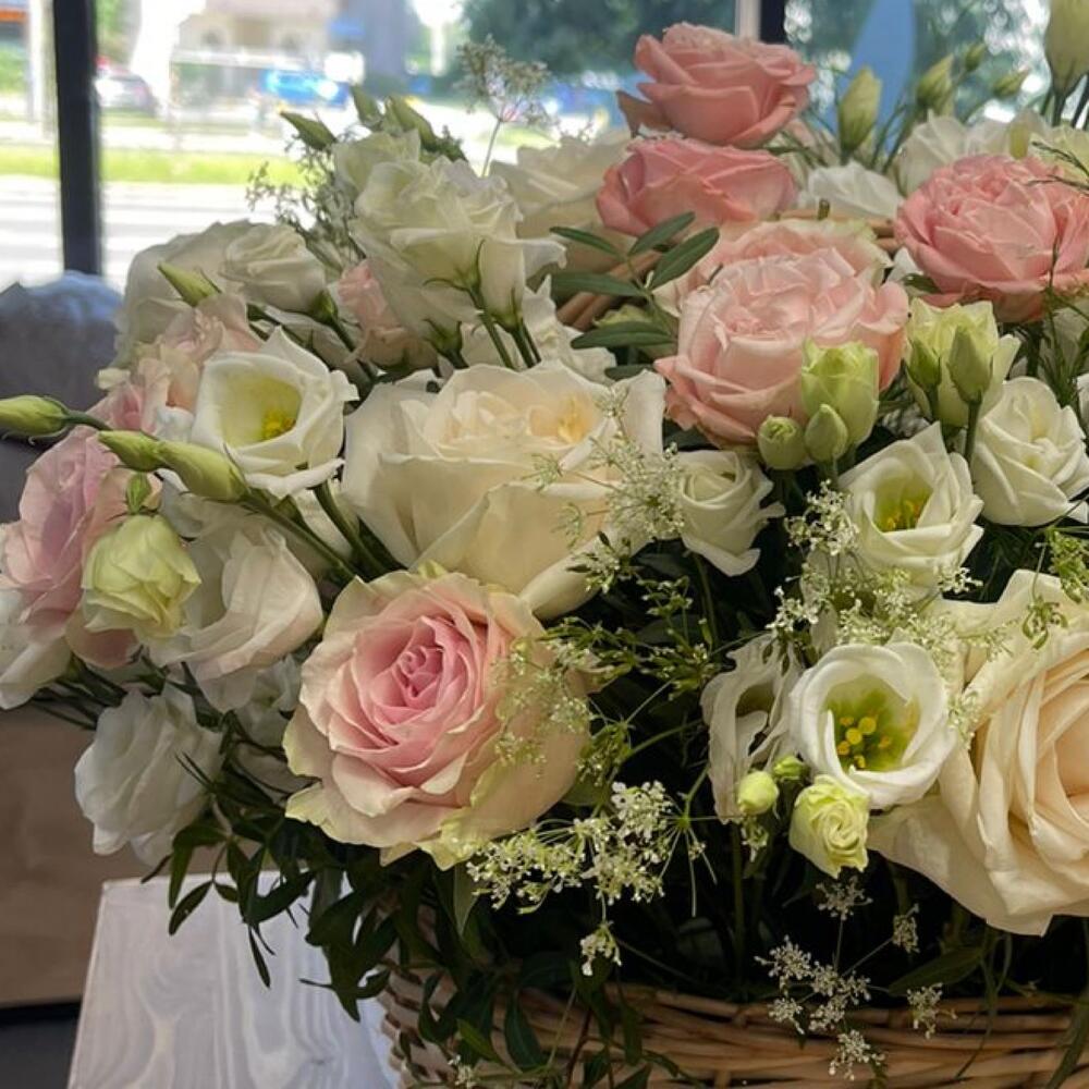 Корзина розами и эустомой