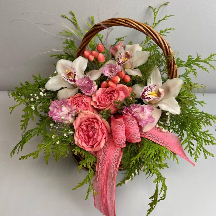Гипсофила – 1 шт.орхидея – 3 шт.Лизиантус – 1 шт.Роза пионовидная – 3 шт.Корзина плетеная – 1 шт.Оазис флористический – 1 шт.декор бант – 1 шт.туя ветка – 1 шт.аспарагус пучок – 1 шт.Гиперикум – 2 шт.