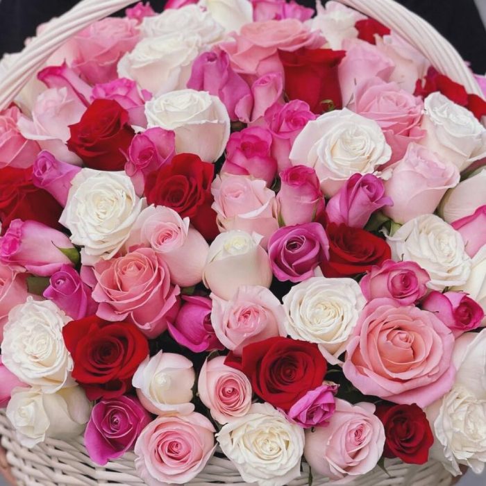 Корзина плетеная – 1 шт.Роза – 151 шт.Оазис флористический – 5 шт.