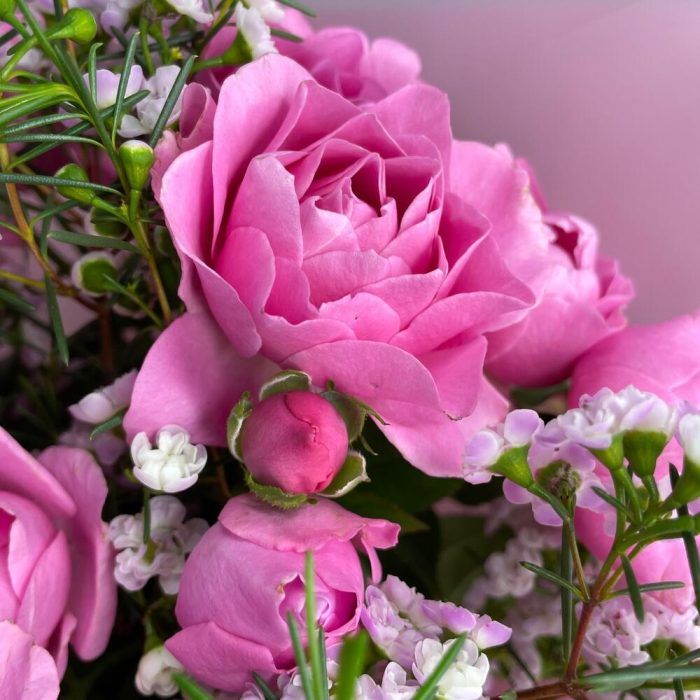 Ваксфлауэр – 2 шт.Роза пионовидная кустовая – 5 шт.Упаковка дизайнерская – 1 шт.