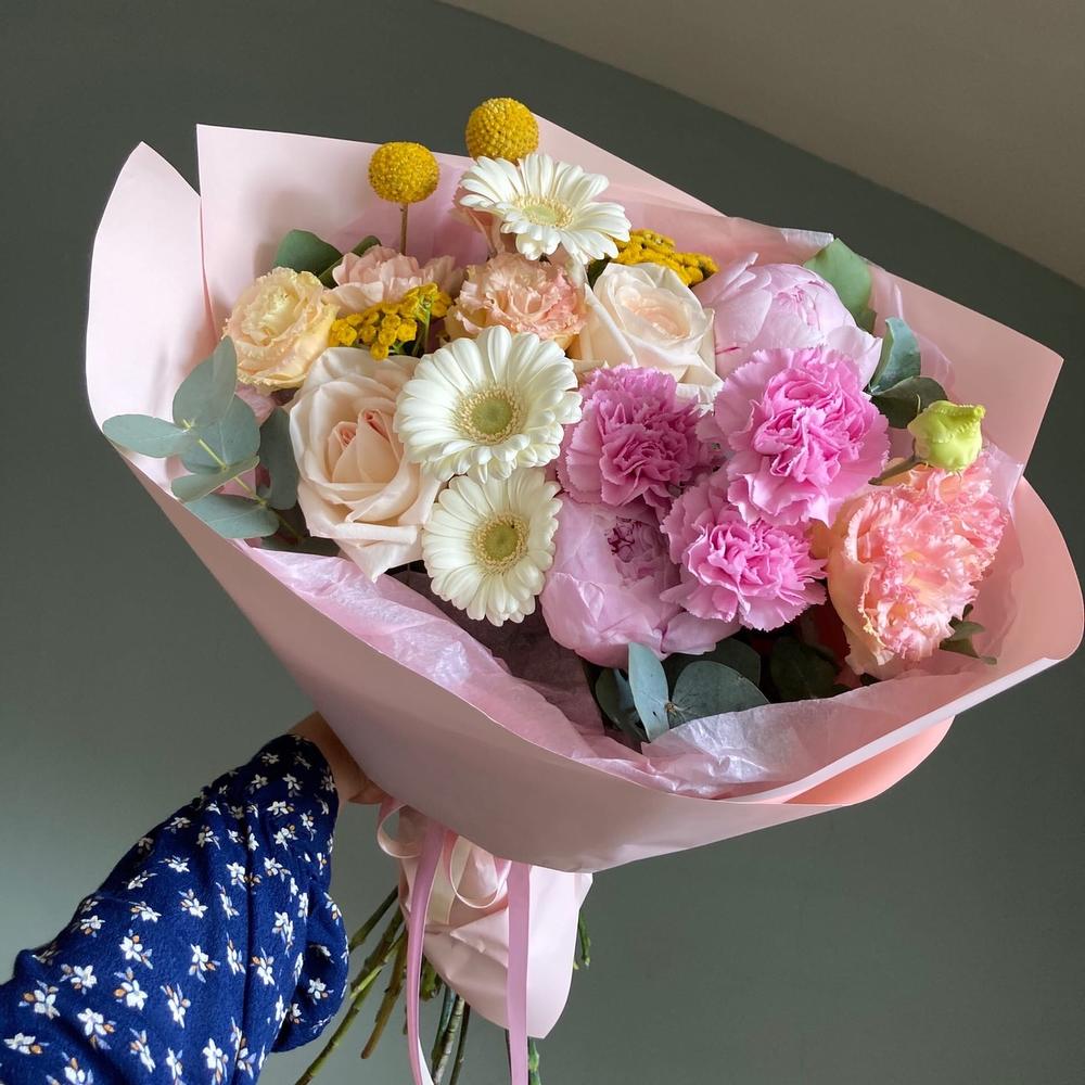 Букет в тёплых розовых, жёлтых и кремовых оттенках, с пионами, пионовидными розами, герберами, гвоздиками, лизиантусом, краспедией и эвкалиптом.Стильное цветочное решение для любого случая.