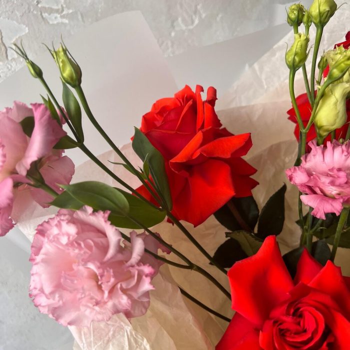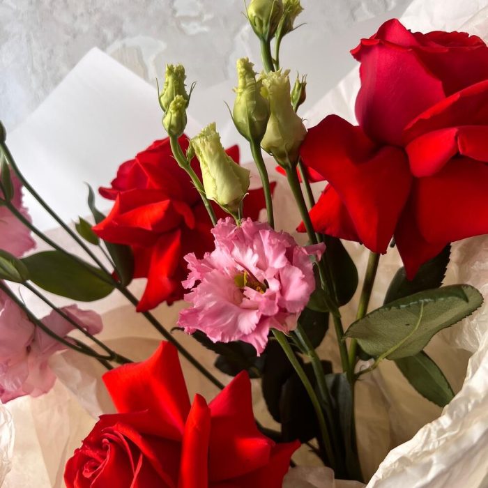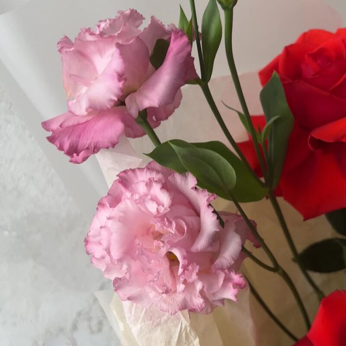 Лизиантус махровый розовый – 2 шт.Роза французская – 3 шт.Авторская упаковка – 1 шт.