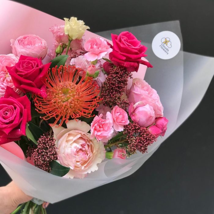 Скиммия – 1 шт.роза сильва пинк пионовидная – 2 шт.Лизиантус – 1 шт.Гвоздика кустовая – 2 шт.Нутан – 1 шт.Роза Шангрила – 3 шт.Роза Кейра пионовидная – 1 шт.Упаковка – 1 шт.