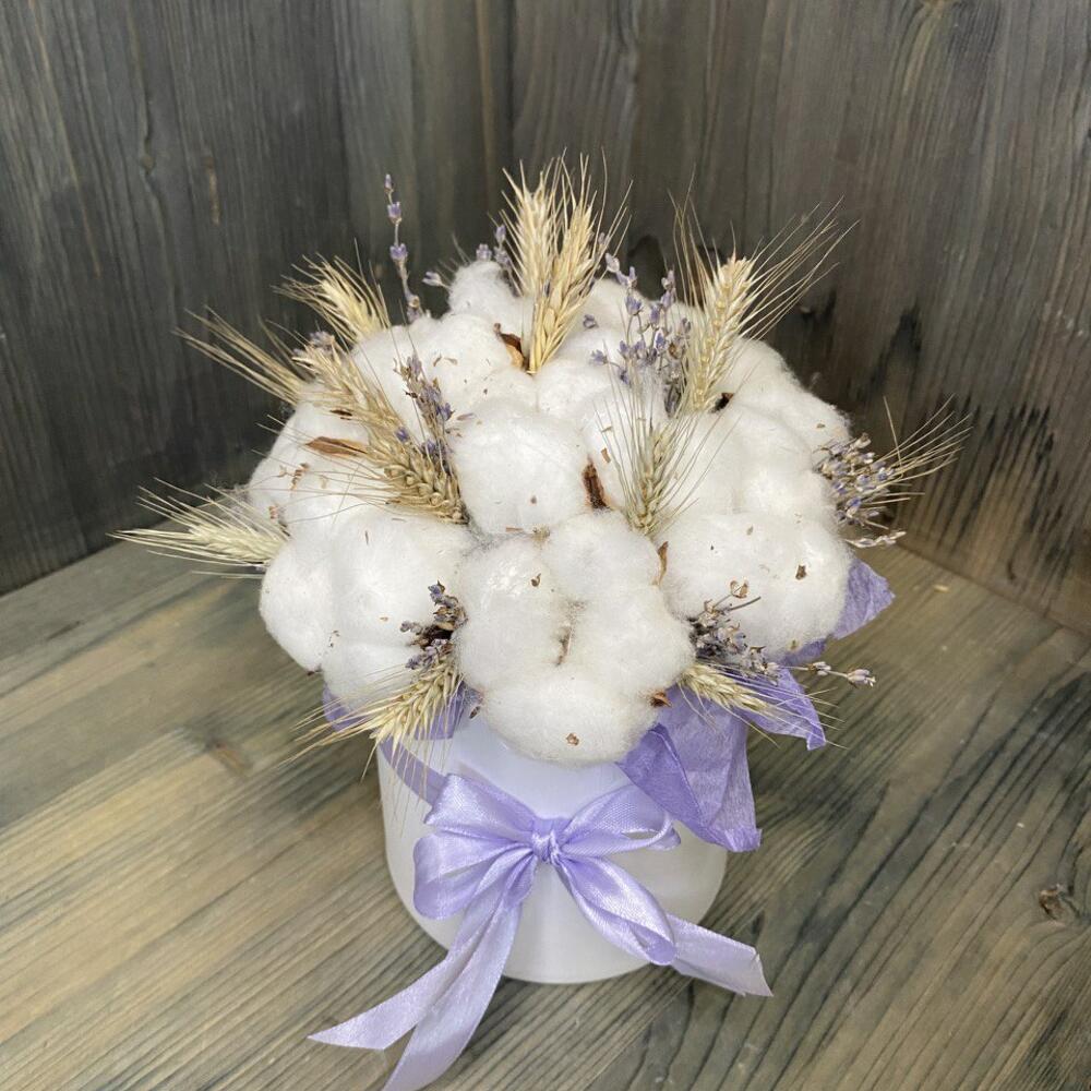 Коробка шляпная – 1 шт.Тишью – 1 шт.Лента атласная – 2 шт.Хлопок натуральный – 10 шт.Рожь – 14 шт.Лаванда пучок – 1 шт.