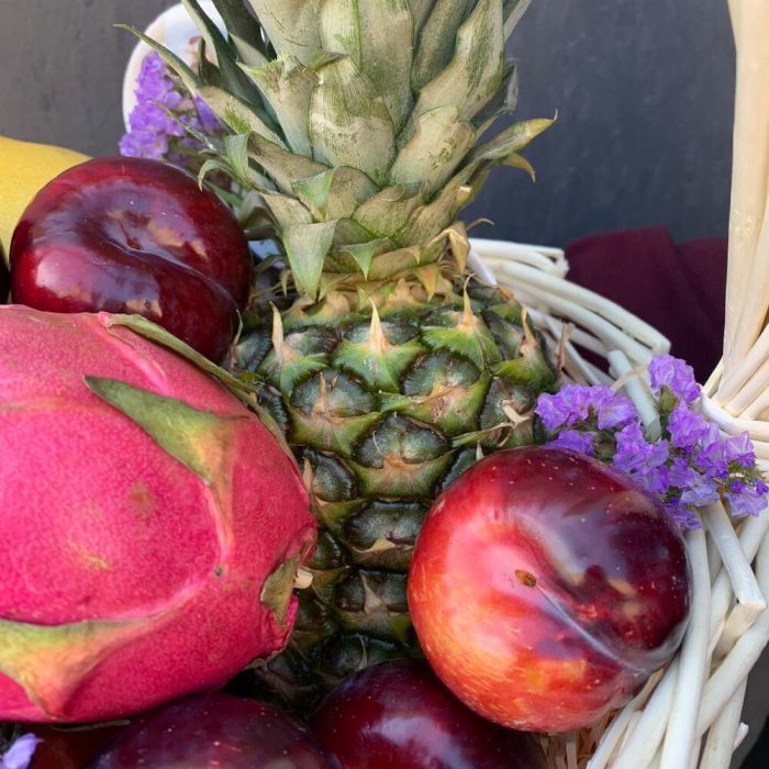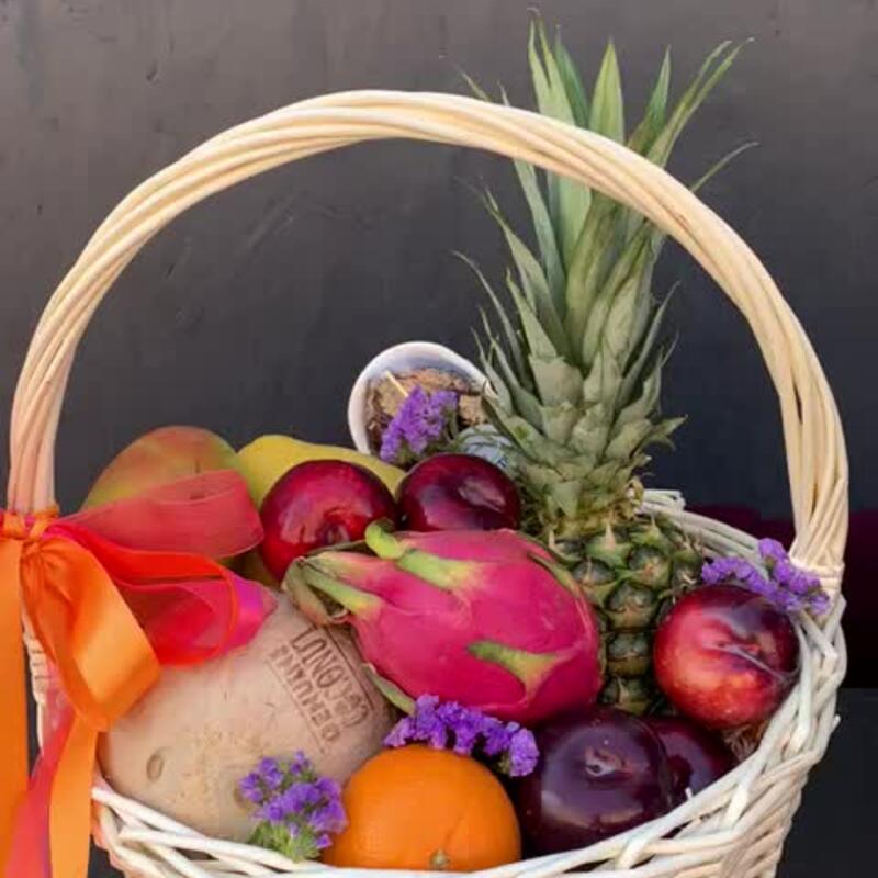 Ананас – 1 шт.Сухоцветы – 5 шт.Яблоко – 3 шт.Мандарин – 3 шт.Корзина плетеная – 1 шт.манго – 1 шт.Помело – 1 шт.Кокос – 1 шт.Слива красная – 5 шт.Драгон фрукт – 1 шт.финики 150 гр – 1 шт.
