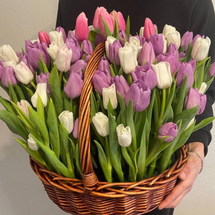 Тюльпан – 101 шт.Корзина плетеная – 1 шт.Оазис флористический – 4 шт.